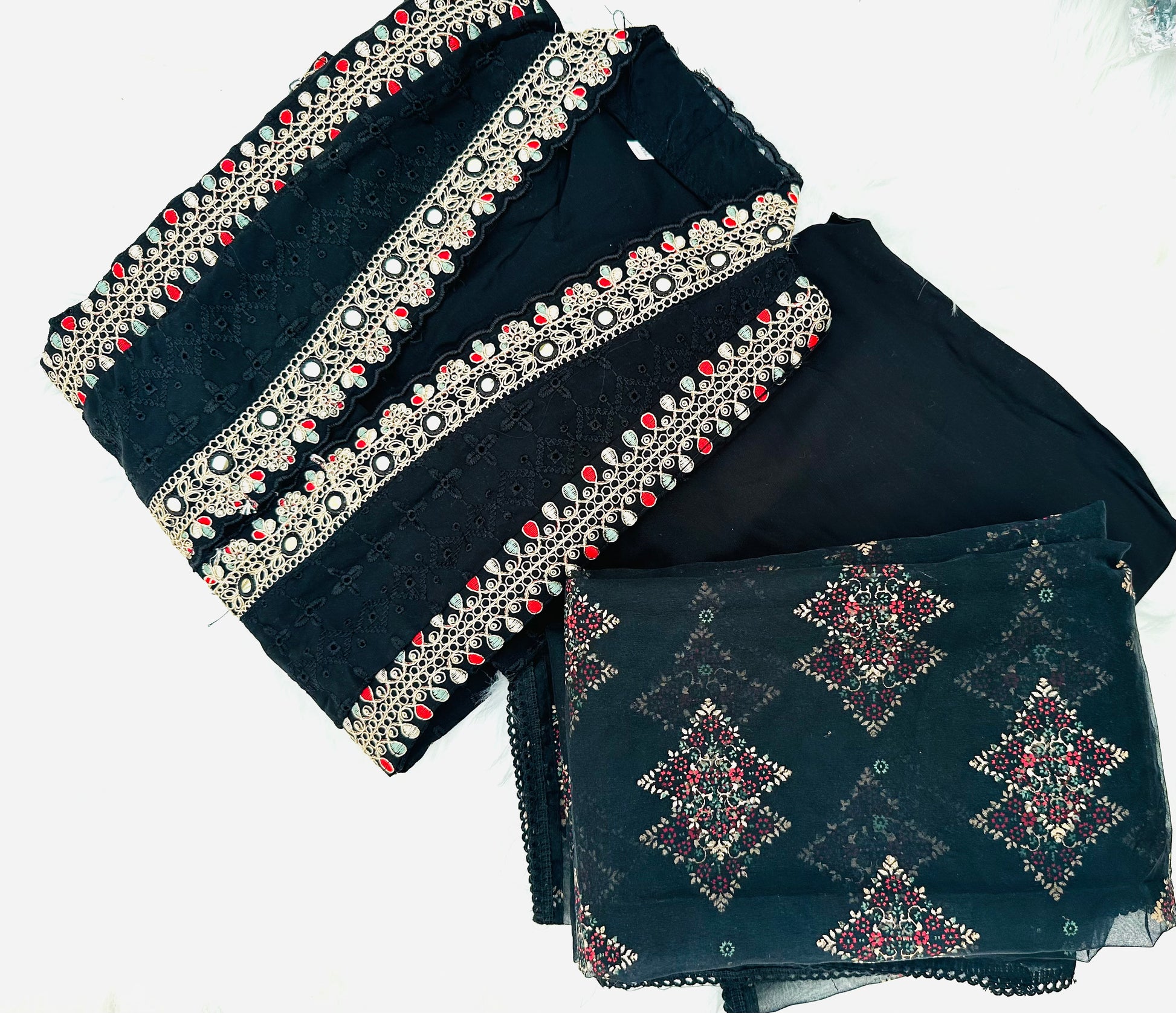 Soft cotton rich Hakoba pattern fabric adorned with intricate mirror and thread work. Comes with embroidered dupatta and plain salwar, perfect for festive wear.