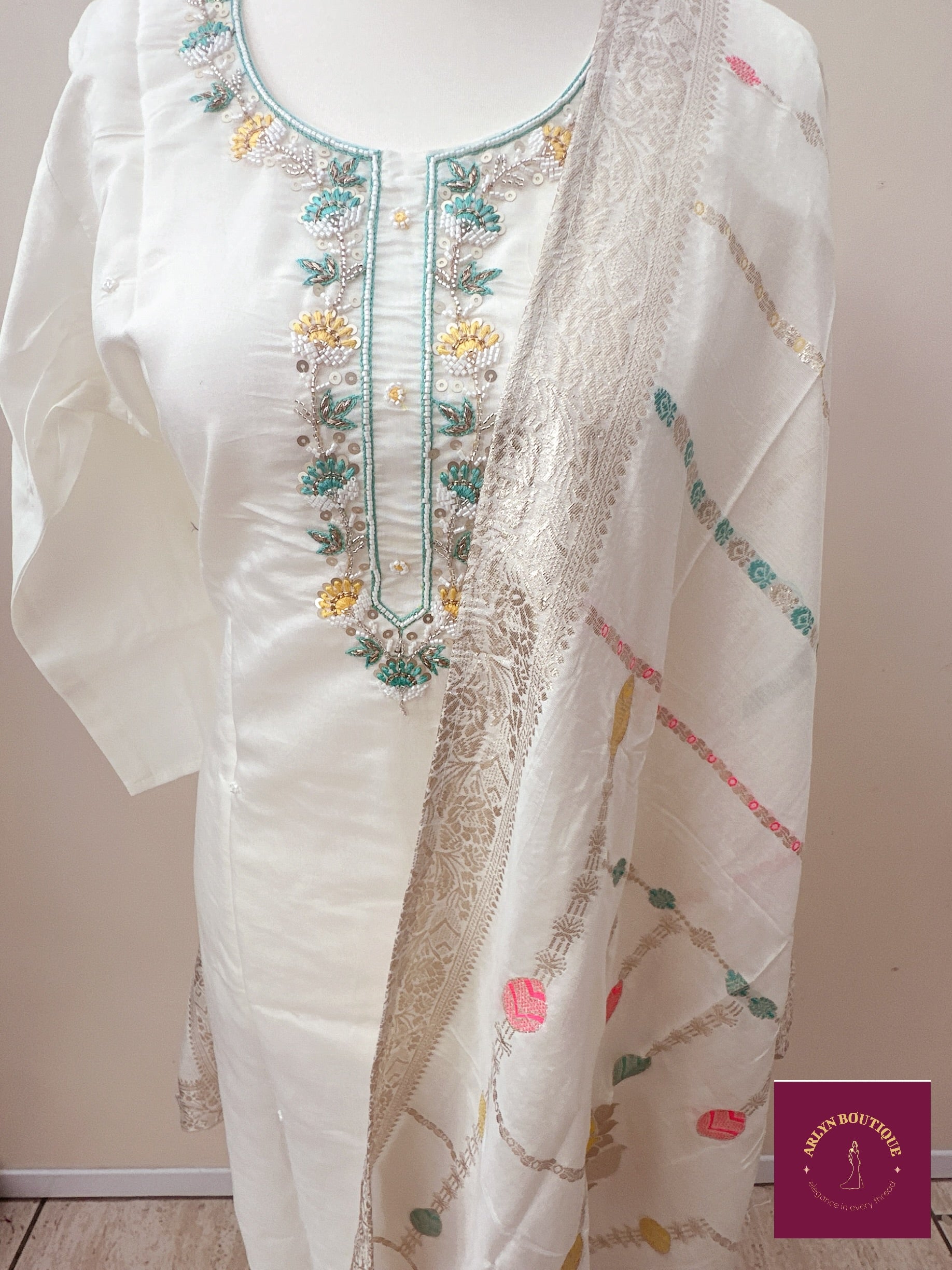 This off-white salwar suit crafted from soft cotton offers exceptional comfort and breathability. Its delicate embroidery adds a touch of elegance, making it suitable for both casual and semi-formal occasions. Available in four sizes, it ensures a precise fit tailored to your needs. Ideal for those seeking a blend of traditional style with modern comfort.