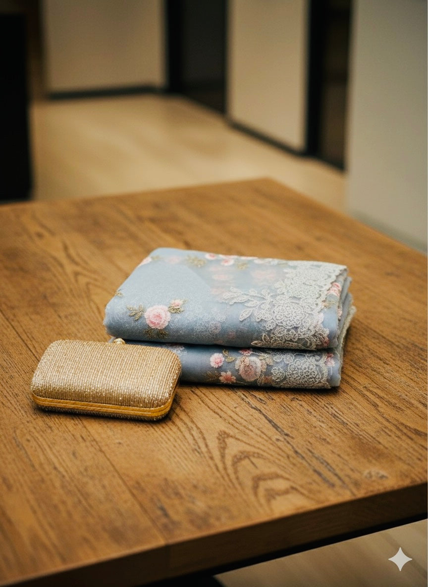 Embrace refined charm with our Elegant Dusty PowderedBlue Net Saree. This beautiful piece combines a serene dusty blue net fabric with romantic pink floral embroidery and subtle sequin embellishments.