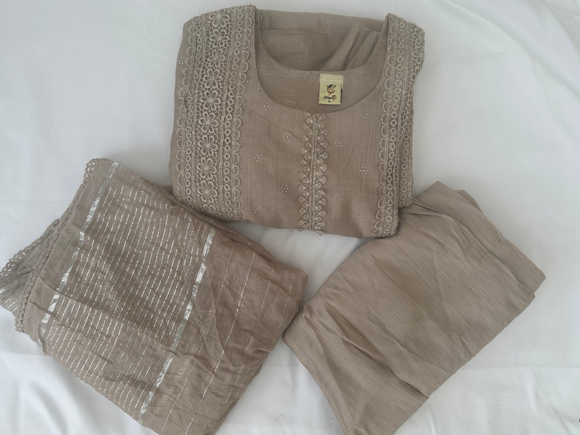 Understated elegance defines this taupe three-piece set. The kurta is decorated with delicate embroidery in lace-like patterns, paired with matching trousers for a graceful silhouette. The dupatta enhances the look with subtle detailing, making it perfect for daytime wear, work functions, or casual outings.